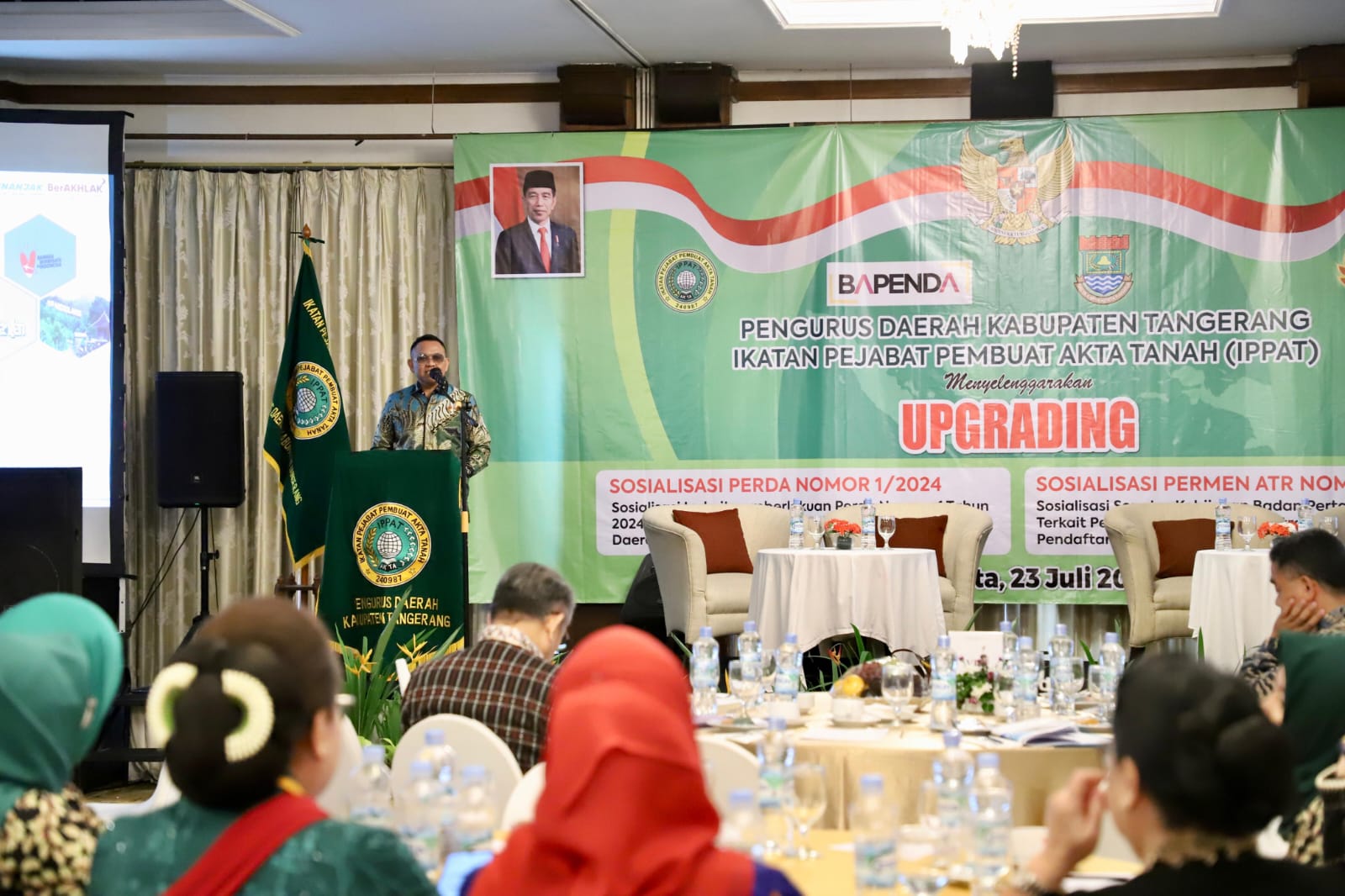 TANGERANG – Selasa (23/7/2024), Kepala Kantor Wilayah Badan Pertanahan Nasional (BPN) Provinsi Banten, Sudaryanto hadir sebagai _Keynote Speech_ dalam kegiatan Upgrading yang diselenggarakan oleh Pengurus Daerah Ikatan Pejabat Pembuat Akta Tanah (IPPAT) Kabupaten Tangerang.