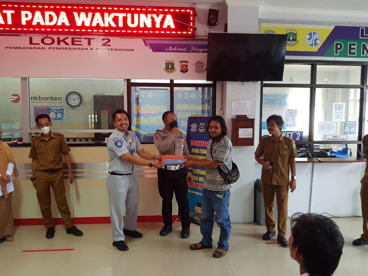 LEBAK – Petugas PJ Samsat Lebak Adytia Nugraha bersama KUPTD Samsat Lebak bpk Suherman, S.E, Kanit Regident Iptu Bobi Nainggolan, dan Kasi PKB Agus Ken ken, S.E melakukan sosialisasi tentang Pergub Banten No 24 tahun 2022 tentang pembebasan denda PKB, bebas pokok dan denda BBNKB II serta pengurangan pokok PKB 20% untuk kendaraan mutasi masuk dari luar Provinsi, yang bertempat di Samsat Lebak. Selasa, (23/08).