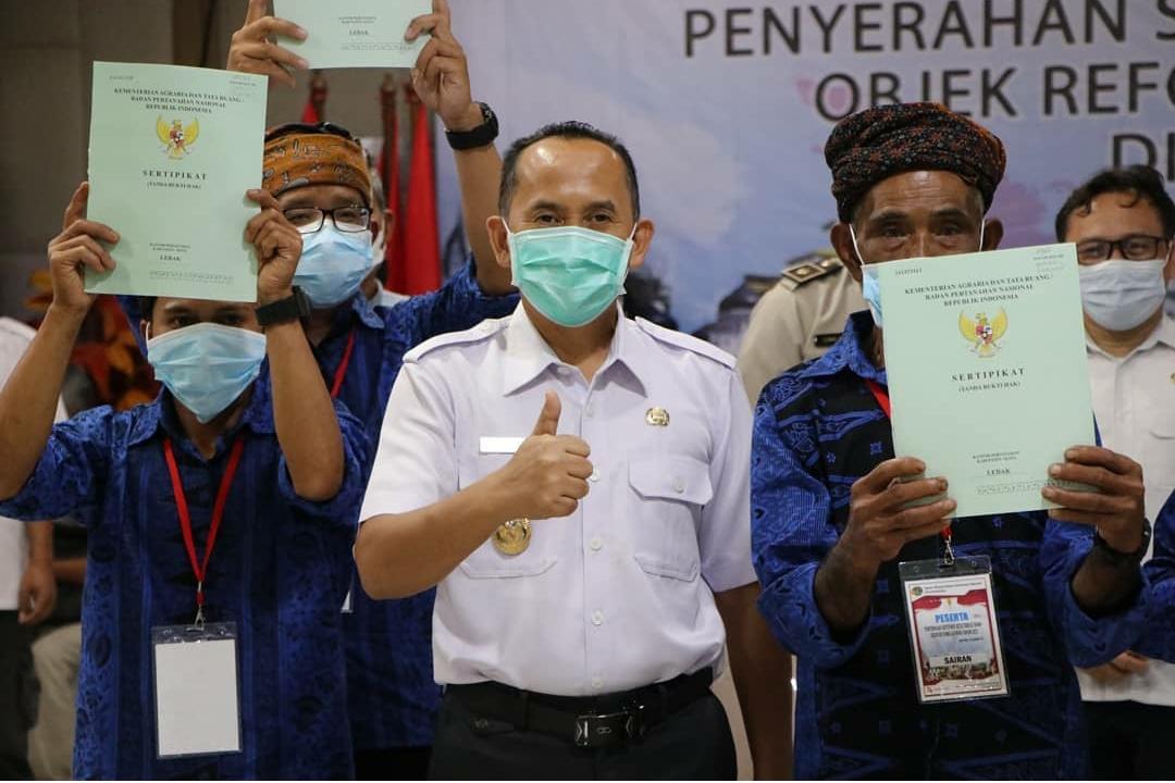 “Saya atas nama pemerintah Kabupaten Lebak mengucapkan terima kasih dan apresiasi setinggi-tingginya kepada Bapak Presiden Republik Indonesia, bahwa saat ini sebanyak 1600 masyarakat di Citorek mendapat pengakuan hukum atas Iahannya dengan adanya sertifikat ini,”kata Ade Sumardi, Kamis(23/09/2021).