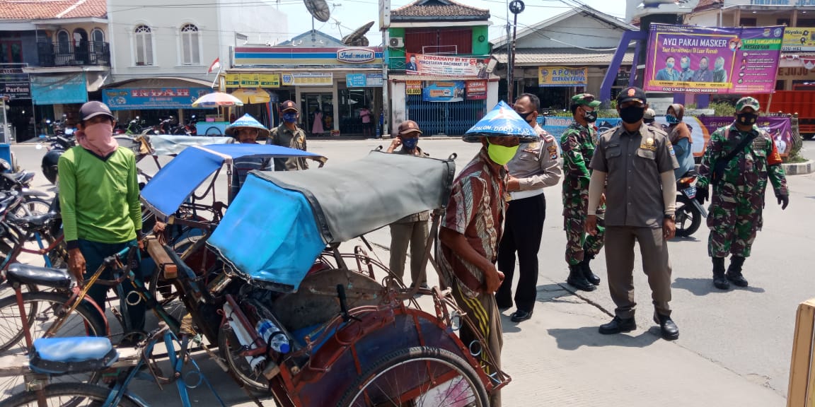 Kabupaten Tangerang- Bersama Tri Pilar Kecamatan Kronjo Koramil 08/Kronjo Kodim 0510/Trs melakukan sosialisasi pemakaian masker kepada tukang becak di bundaran Pasar Kronjo Kabupaten Tangerang, Sabtu (24/10/2020).