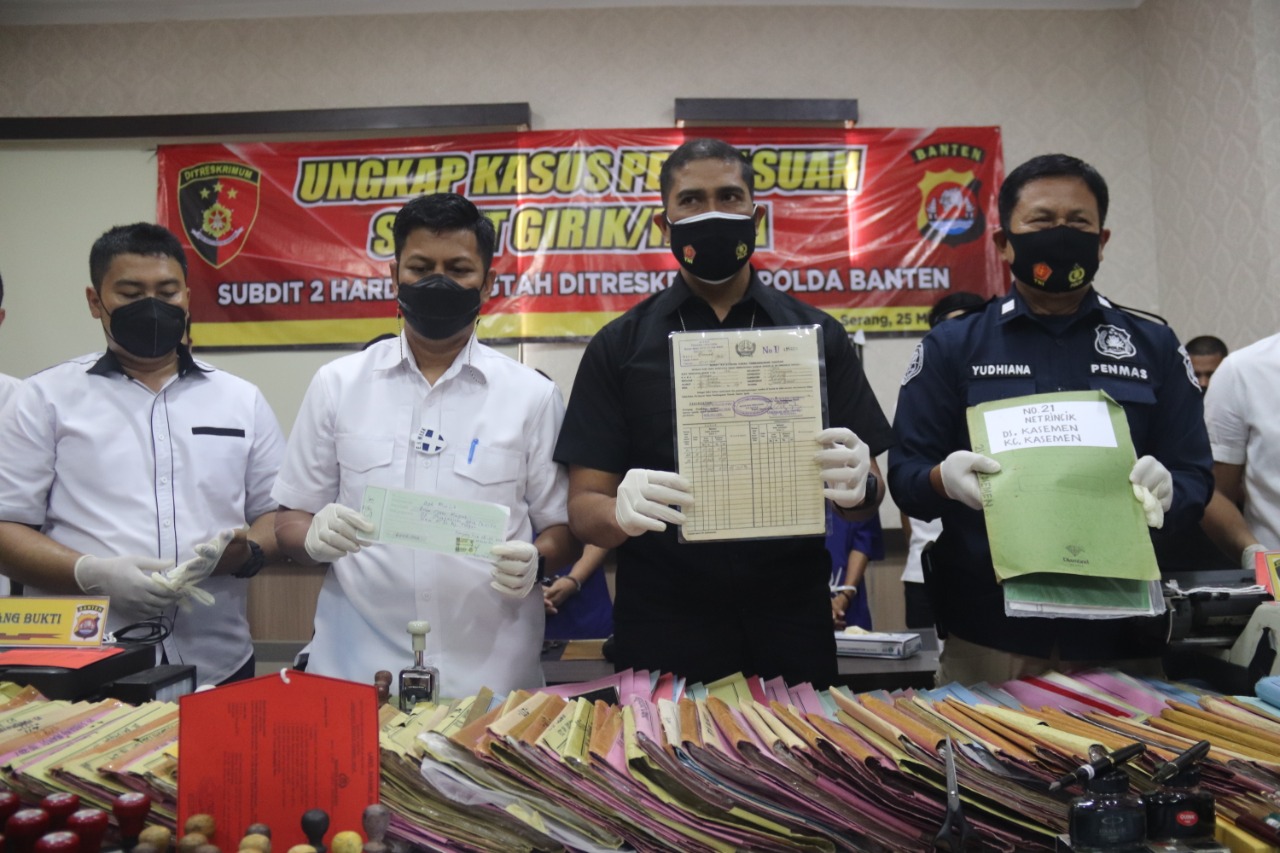 “Saat ini tersangka dan sejumlah barang bukti sudah diamankan di Mapolda Banten untuk pemeriksaan lebih lanjut. Untuk para tersangka dikenakan pasal sesuai dengan perannya masing-masing. MRH dikenakan pasal 263 ayat 1 KUHPidana dengan ancaman hukuman penjara 6 tahun, sedangkan tersangka CJ, AH dan S karena turut serta membantu tindak pidana dikenakan pasal 378 KUHPidana dengan ancaman hukuman penjara 4 tahun,” tutup Edy Sumardi.
