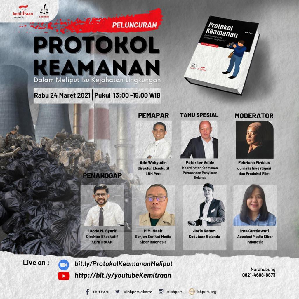 JAKARTA. – Buku Protokol Keamanan Jurnalis dalam Meliput Isu Kejahatan Lingkungan diluncurkan, Rabu, 24 Maret 2021 oleh Lembaga Bantuan Hukum (LBH) Pers bersama Kemitraan Partnership secara online.