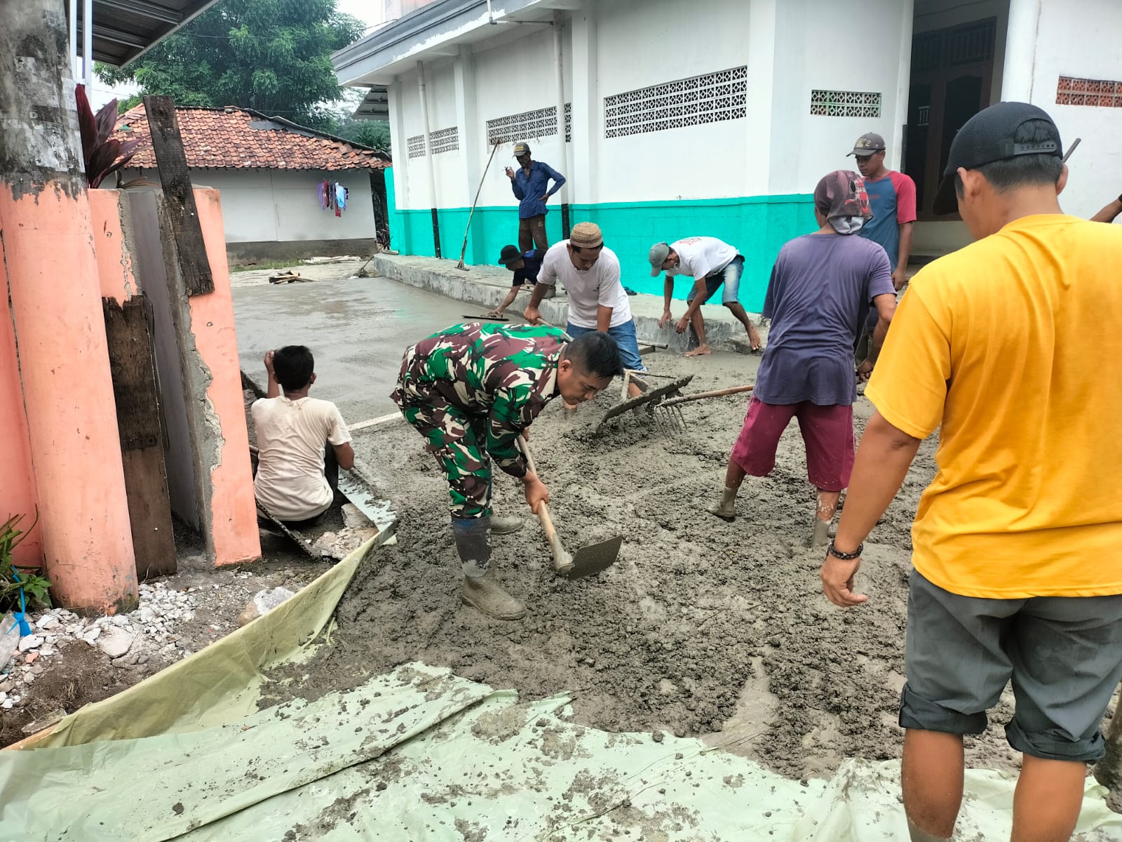 SIBERINDO.CO – Bintara Pembina Desa (Babinsa) Koramil 0602-19/Cikande Kodim 0602/Serang Sersan Dua (Serda) Mulyono, bersama-sama dengan warga turut serta dalam sebuah kegiatan karya bakti pengecoran jalan, bertempat di Kampung Telaga Desa Bakung, Kecamatan Cikande, Kabupaten Serang, Provinsi Banten, Kamis (25/04/2024).