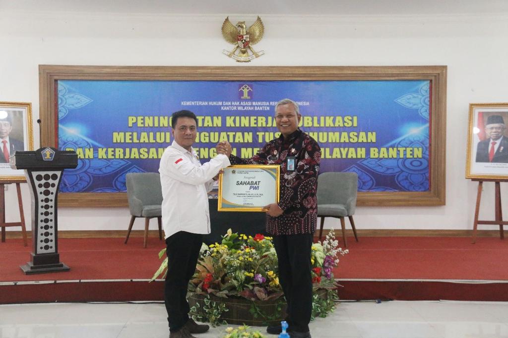 Dalam kegiatan tersebut juga, Ketua PWI Provinsi Banten Rian Nopandra menyerahkan Apresiasj Berupa Anugerah Sahabat Media Kepada Kepala Kanwil Kemenkumham Banten Tejo Harwanto.