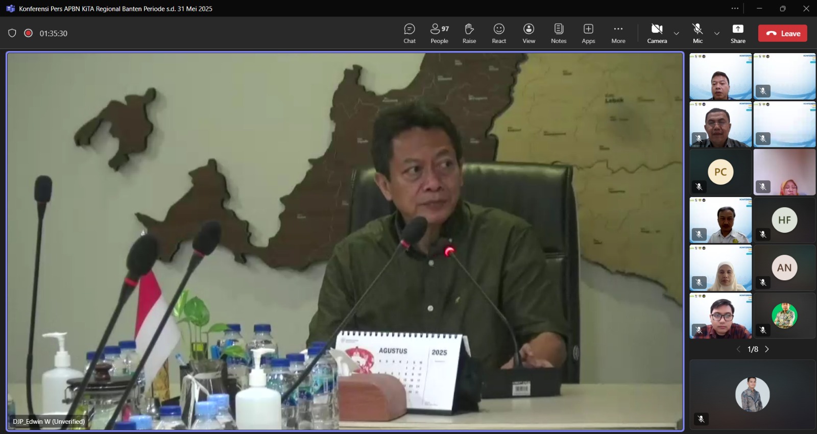 SERANG – Secara keseluruhan kinerja APBN Provinsi Banten sampai dengan 31 Mei 2025 realisasinya lebih baik dari bulan sebelumnya. Hal ini terlihat realisasi pendapatan dan belanja negara mulai meningkat seperti yang disampaikan oleh para pimpinan Kemenkeu Satu Regional Banten yakni Kepala Bidang PPA II Kanwil Ditjen Perbendaharaan Provinsi Banten, Mohamad Zaki, Kepala Bidang Pemeriksaan, Penagihan, Intelijen dan Penyidikan Kanwil DJP Banten, Edwin Warganingrat Muliya, Kepala KPU Bea dan Cuka Soekarno Hatta, Gatot Sugeng Wibowo, dan Kepala Kanwil DJKN Banten, Djanurindro Wibowo.