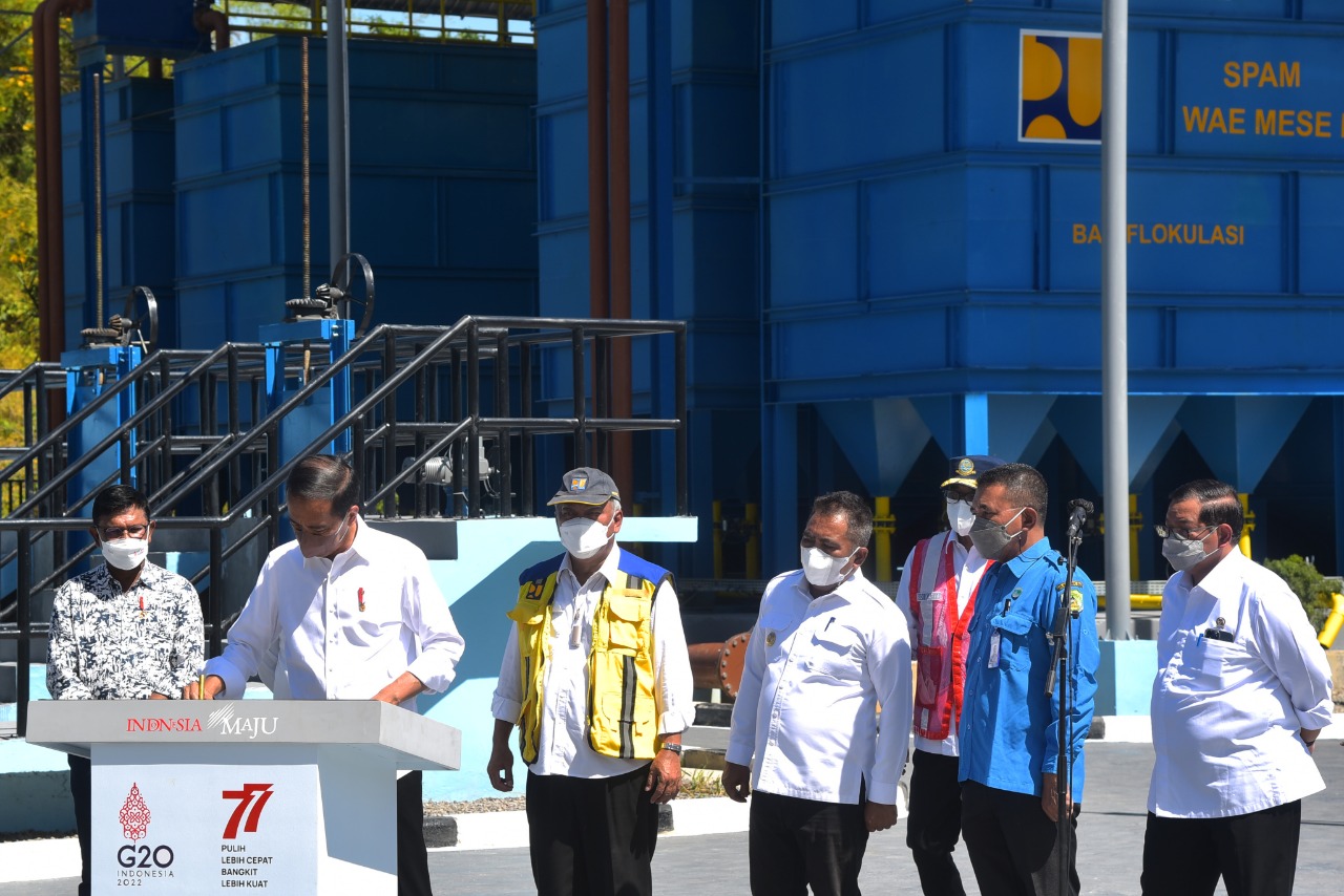 NTT – Presiden RI Joko Widodo (Jokowi) didampingi Ibu Iriana Jokowi meresmikan sistem penyediaan air minum (SPAM) Wae Mese II di Kabupaten Manggarai Barat, Provinsi Nusa Tenggara Timur (NTT), Jumat (22/07/2022). SPAM Wae Mese II merupakan bagian dari penataan infrastruktur pendukung pariwisata di Labuan Bajo.
