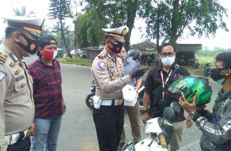 Tampak turut mendukung kegiatan Pokja Wartawan Harian Kabupaten Tangerang, Kasatlantas Polres Kota Tangerang Akp Roby Heri Saputra, Halal Mart Tigaraksa yang memberikan sedekah nasi bungkus pengguna jalan, Muspika Kecamatan dan Puskesmas di titik pembagian Masker. (Beb/Hendra)