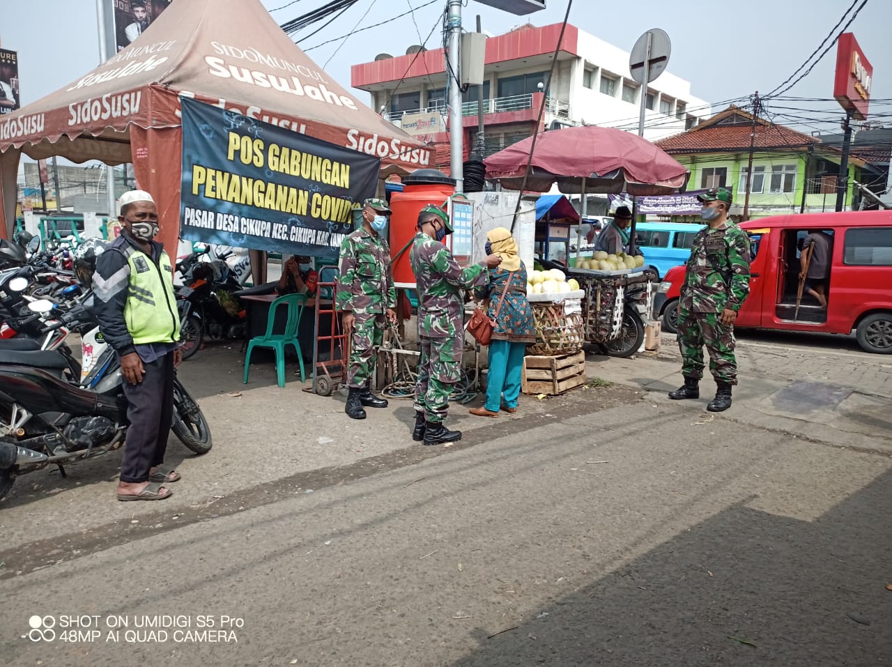“PDMPK yang di terapkan adalah sistem 3 M yaitu Mencuci Tangan, Memakai Masker dan Menjaga Jarak, setelah dari pasar segeralah mandi untuk menghindari virus Corona,” ujar Danramil 04/Cikupa Kapten Inf Khoiril Anwar.