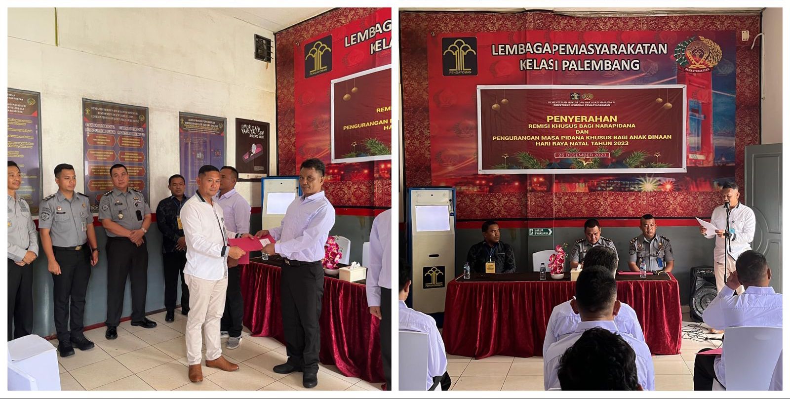 Pemberian Remisi Khusus Hari Raya Natal tahun 2023 di berikan langsung oleh kabid pembinaan, Jonson manurung kepada 3 orang perwakilan dari warga binaan Lapas Kelas I Palembang.