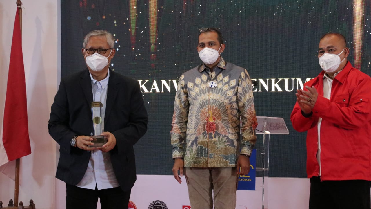 Penghargaan diberikan secara langsung oleh Wakil Menteri Hukum dan HAM RI, Edward Omar Sharif Hiariej kepada Kepala Kantor Wilayah Kementerian Hukum dan HAM Banten, Agus Toyib bertempat di Grand Ballroom Hotel Santika TMII, Jakarta. (25/2/2021).