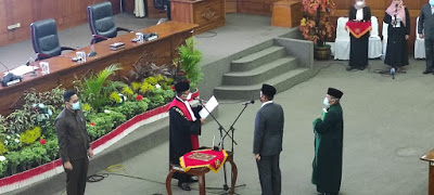 Isro Miraj yang resmi gantikan Endang Effendi menjadi Ketua DPRD yang baru, pengambilan sumpah jabatan yang dilaksanakan dengan sidang paripurna istimewa DPRD kota Cilegon di kantor DPRD Kota Cilegon. Kamis, 25/03/2021.