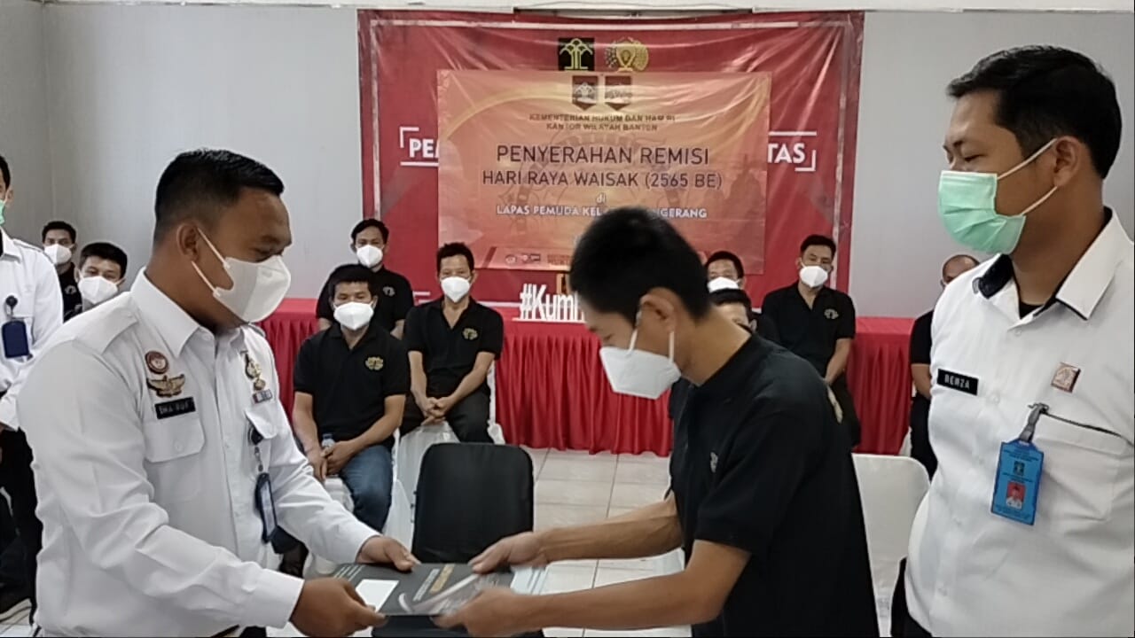 Lembaga Pemasyarakatan (Lapas) Pemuda Kelas IIA Tangerang menggelar penyerahan Remisi Khusus (RK) Waisak tahun 2021 kepada para Warga Binaan Pemasyarakatan yang beragama Buddha. Rabu 926/05/2021).