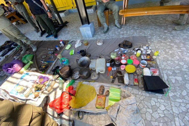 Barang bukti yang ditemukan terdiri atas 25 jenis, tas, berbagai macam senjata tajam, ponsel, perkakas, walkie talkie, bahan makanan, peralatan masak, pakaian, solar cell atau alat semi konduktor, dan lain sebagainya.