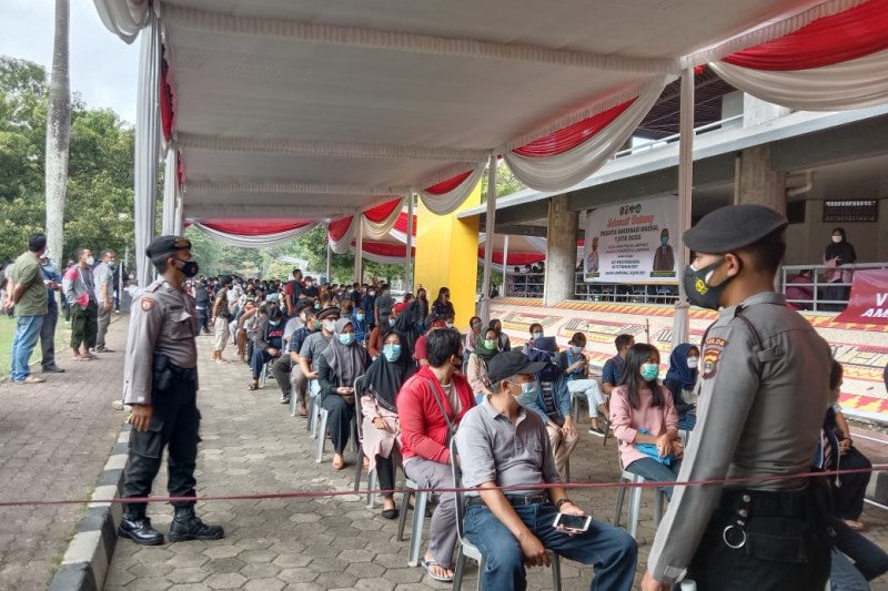 Bandarlampung – Polda Lampung dan polres jajaran menggelar vaksinasi massal di 345 lokasi di Provinsi Lampung, dalam rangka Hari Ulang Tahun ke-75 Bhayangkara.