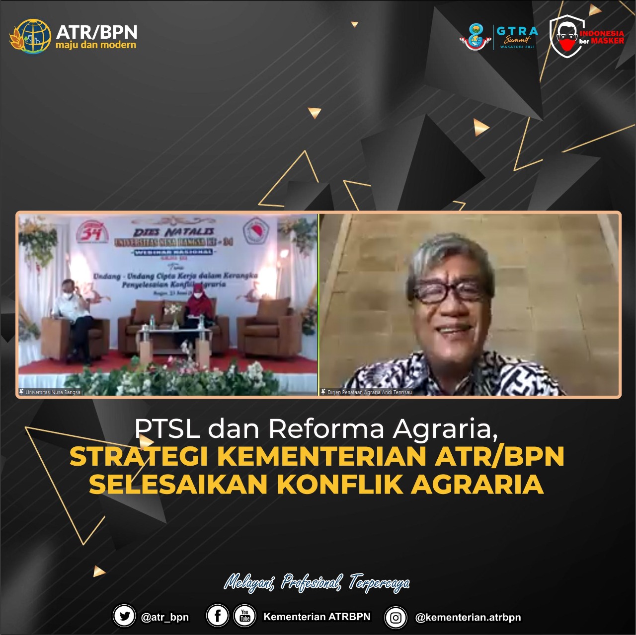 Dilansir dari situs atrbpn.go.id, Seperti yang dipaparkan oleh Direktur Jenderal Penataan Agraria, Kementerian Agraria dan Tata Ruang/Badan Pertanahan Nasional (ATR/BPN), Andi Tenrisau dalam Webinar Nasional Seri III, Dies Natalis Universitas Nusa Bangsa ke-34 dengan tema UU Cipta Kerja dalam Kerangka Penyelesaian Konflik Agraria pada Rabu, (23/06/2021).