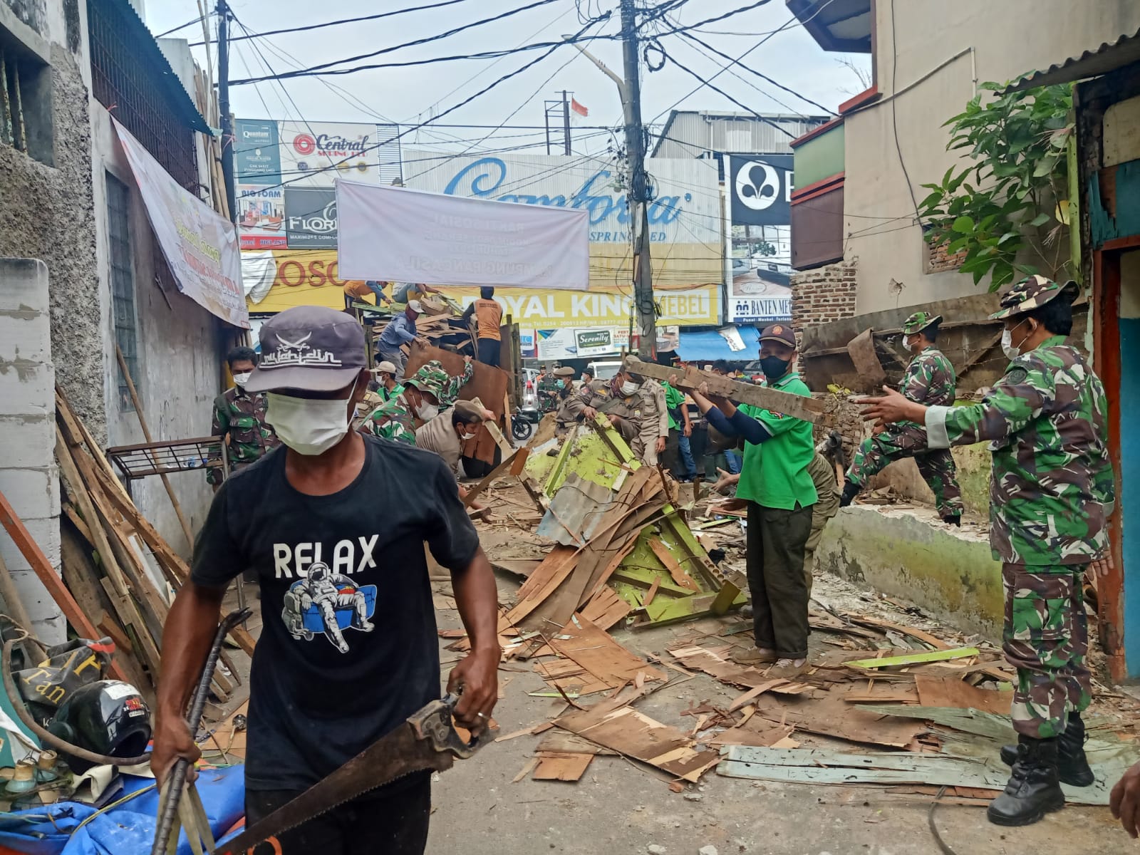 “Hari ini kami memulai pembenahan dengan membersihkan bangunan liar yang ada di pintu masuk Mangga Dua ini, karena nantinya akan kita bangun gapura sebagai pintu masuk menuju Kampung Pancasila,” jelas Danramil 0602-01/Kota Serang Kapten Infanteri Jakson Beay.