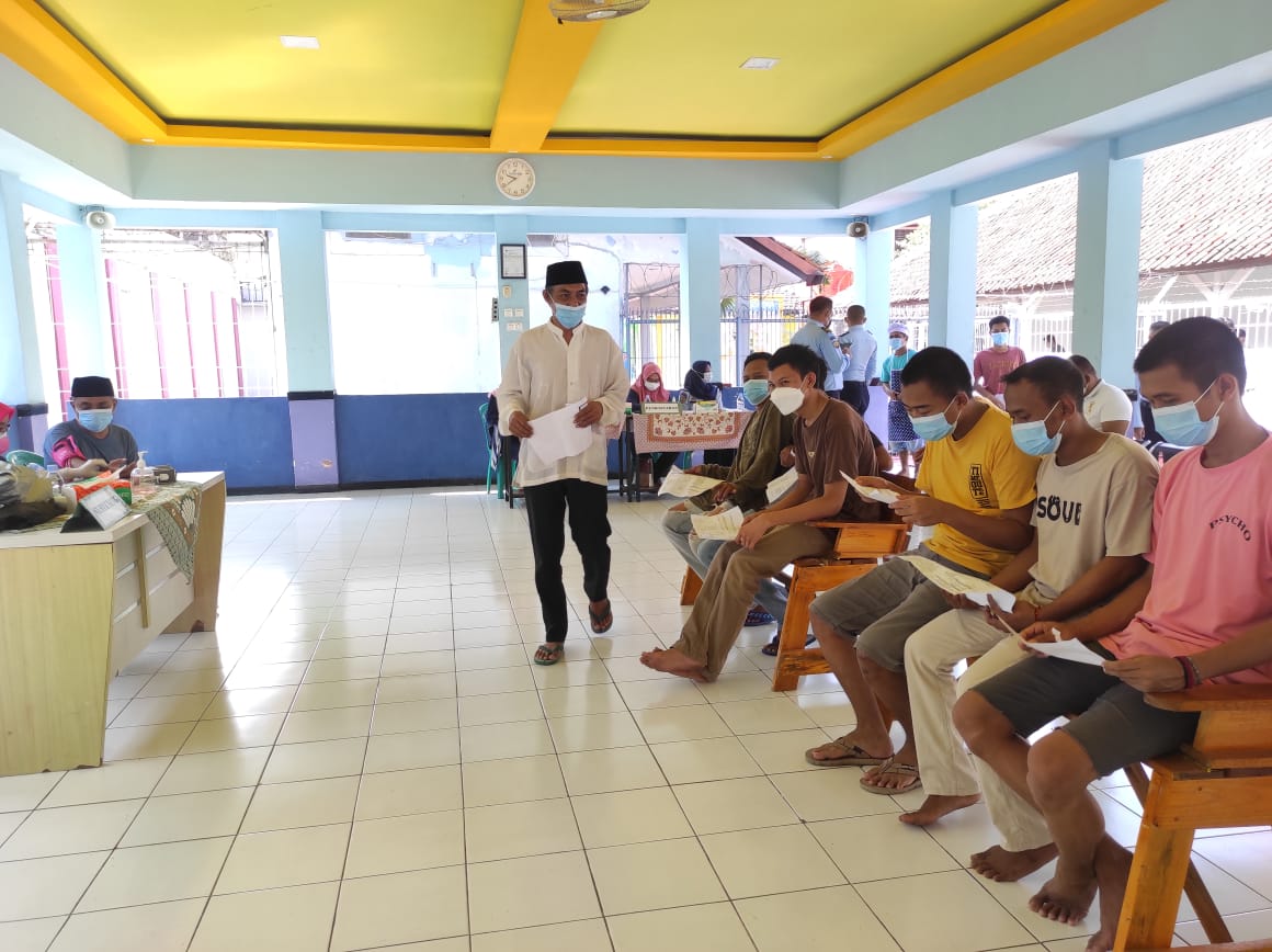 PANDEGLANG,-Sebanyak 241 Warga Binaan Pemasyarakatan Rutan Kelas IIB Pandeglang mengikuti kegiatan Vaksinasi Covid-19 dosis kedua, kegiatan vaksinasi juga diikuti oleh Pegawai Rutan. Kegiatan pemberian vaksin ini dilaksanakan bekerja sama dengan Dinas Kesehatan Kabupaten Pandeglang yang bertempat di Aula Rutan Kelas IIB Pandeglang. Kamis (26/08/2021).