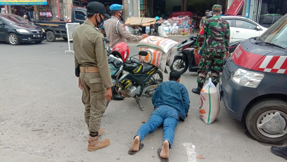 Pantauan dilapangan, tak sedikit pengendara yang tidak menggunakan masker, agar tidak kembali terulang aparat penegak hukum langsung memberikan sangsi sosial sebagai efek jera.