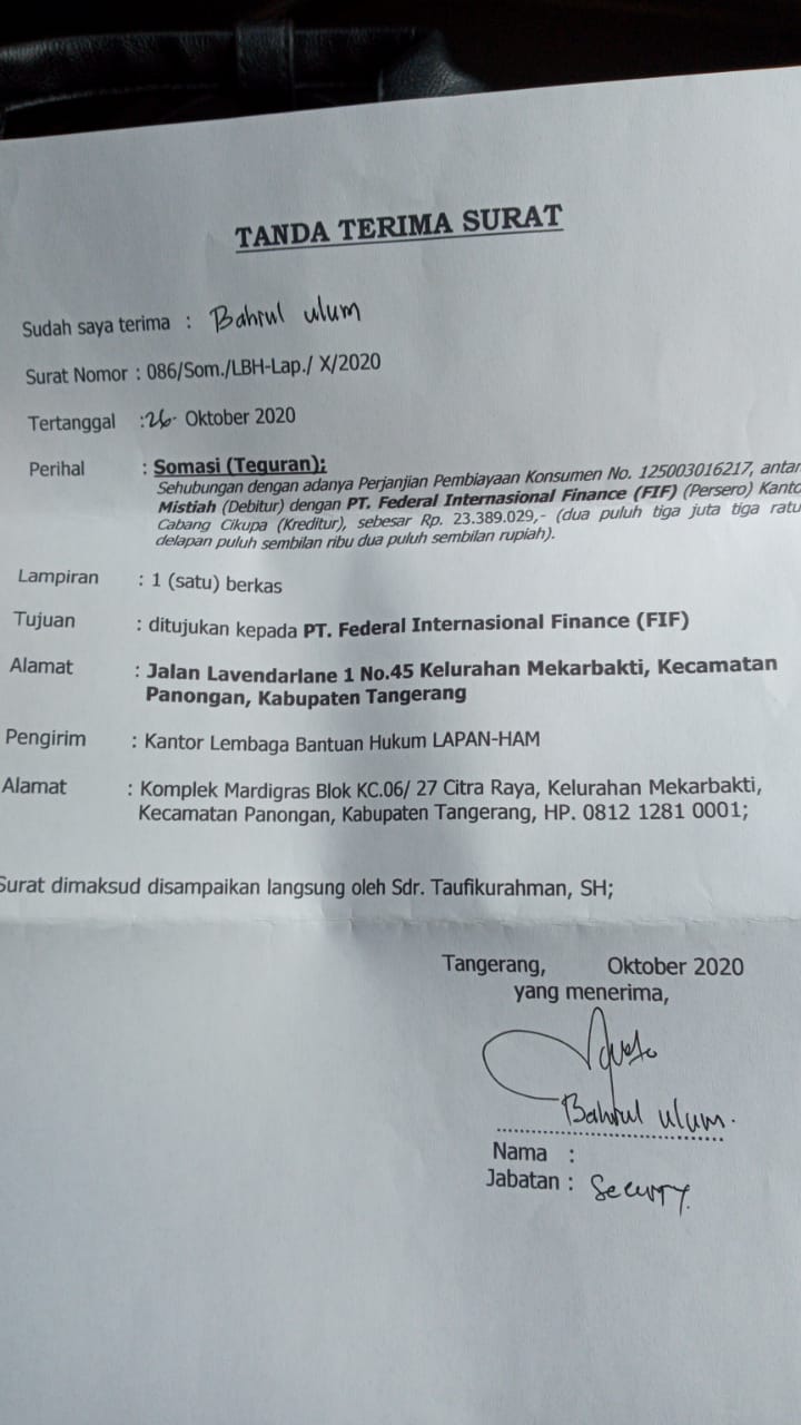 Tangerang – Lembaga Bantuan Hukum LapanHam yang beralamat kantor di komplek Mardigrass blok KC 6 nomor 7 Citra Raya kecamatan panongan kabupaten tangerang, somasi perusahaan pembiayaan FIF karena diduga melakukan penarikan dan melelang kendaraan konsumen tanpa prosedur hukum yang ditetapkan pemerintah Indonesia. Senin, (26/10/20).