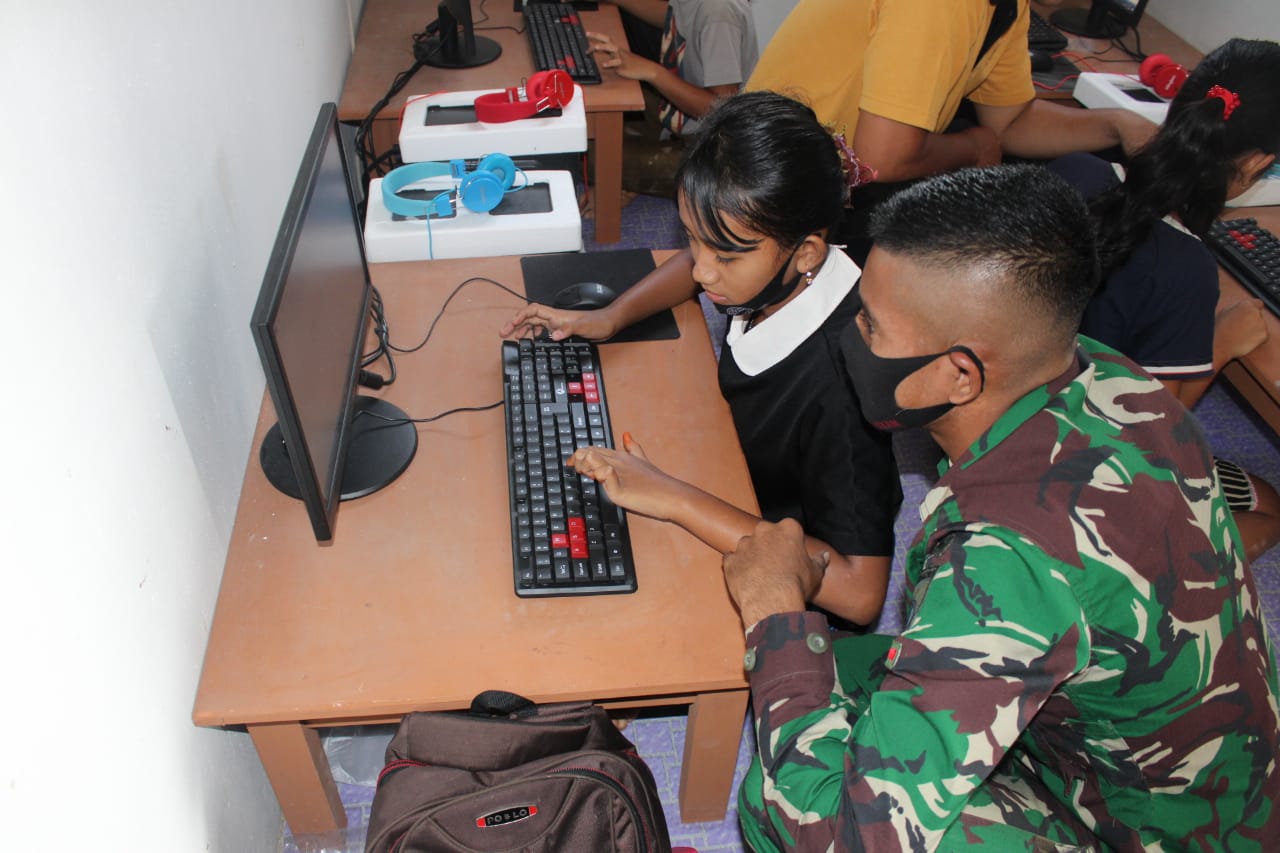 “Pratu Jeflin dan Prada La Ode Saman membantu para guru mengenalkan materi komputer kepada murid-murid SD 25 Perimpah,” ucap Letkol Inf Catur Irawan.
