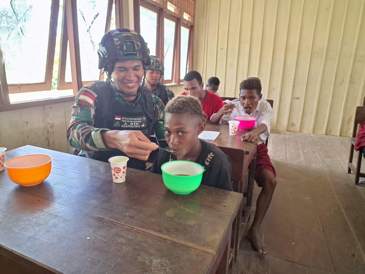 Keerom ~ Sebagai bentuk kepedulian dan memenuhi kebutuhan gizi serta nutrisi anak-anak di wilayah perbatasan, Pos Towe Hitam Satgas Yonif 310/KK bagikan bubur kacang hijau kepada siswa-siswi SDN Inpres Towe Hitam di Distrik Towe, Kabupaten Keerom, Senin (26/2/2024).