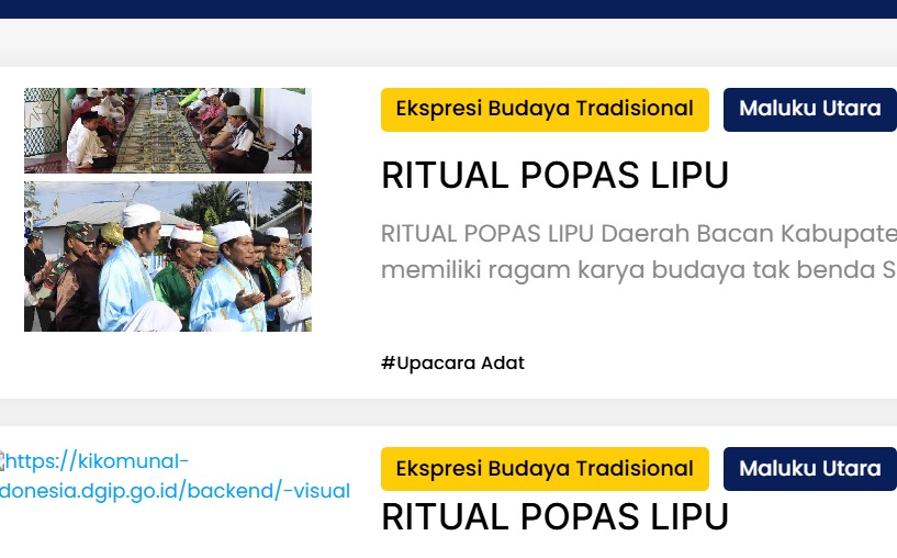 Berdasarkan sumber pengkalan data Direktorat Jenderal Kekayaan Intelektual (DJKI) Kemenkum, Ritual Popas Lipu merupakan ekspresi budaya tradisional yang memiliki ragam karya budaya tak benda.