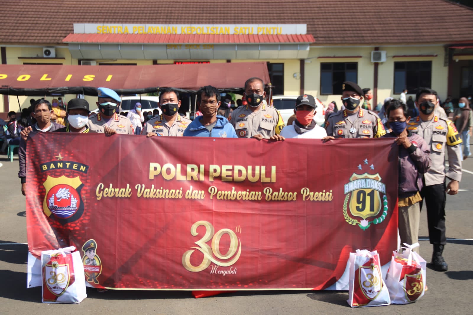 PANDEGLANG – Polri Peduli, Gebrak Vaksinasi dan Pemberian Baksos oleh Alumni Akademi Polisi (Akpol) 1991 Polda Banten kepada masyarakat yang terdampak pandemi Covid-19 di Polres Pandeglang.