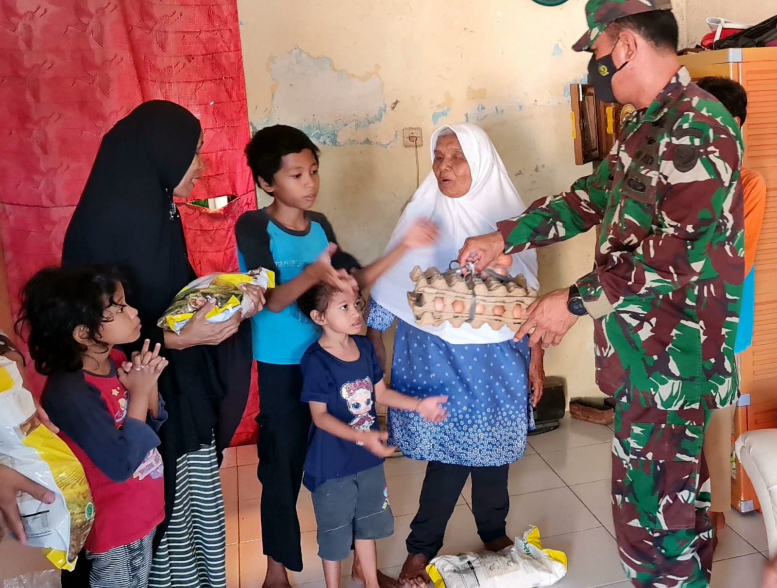 Berawal dari informasi yang didapatkan dari masyarakat melalui Babinsa Kelurahan Unyur, Danramil 0602-02/Kota Serang Kapten Inf Jakson Beay bersama Babinsa Kelurahan Unyur dan beberapa anggotanya, menyambangi keluarga Ibu Nining, untuk memberikan bantuan sembako, Jumat, 27 Agustus 2021.