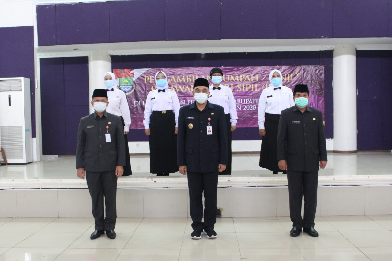 Prosesi pengambilan sumpah/janji dipimpin oleh Bupati Tangerang Ahmed Zaki Iskandar disaksikan Sekretaris Daerah Moch Maesyal Rasyied dan Kepala Badan Kepegawain dan Pengembangan SDM Kabupaten Tangerang Hendar Herawan.
