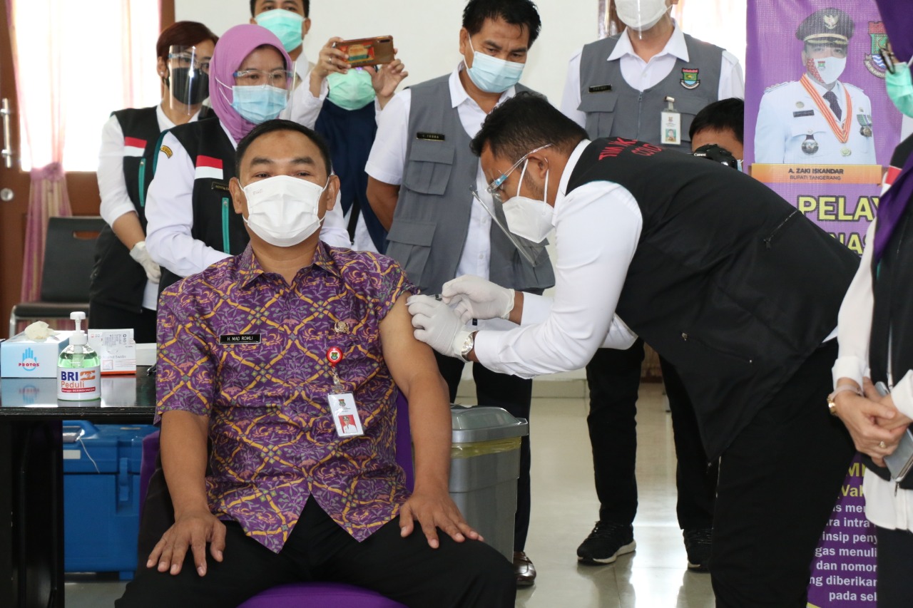 Tangerang – Bupati Tangerang A.Zaki Iskandar laksanakan Vaksin Covid-19 kedua kali, sekaligus pencanangan Vaksinasi Covid-19 di wilayah Kabupaten Tangerang, bertempat di Gedung Serba Guna (GSG) di Tigaraksa, Kamis, (28/01/2021).