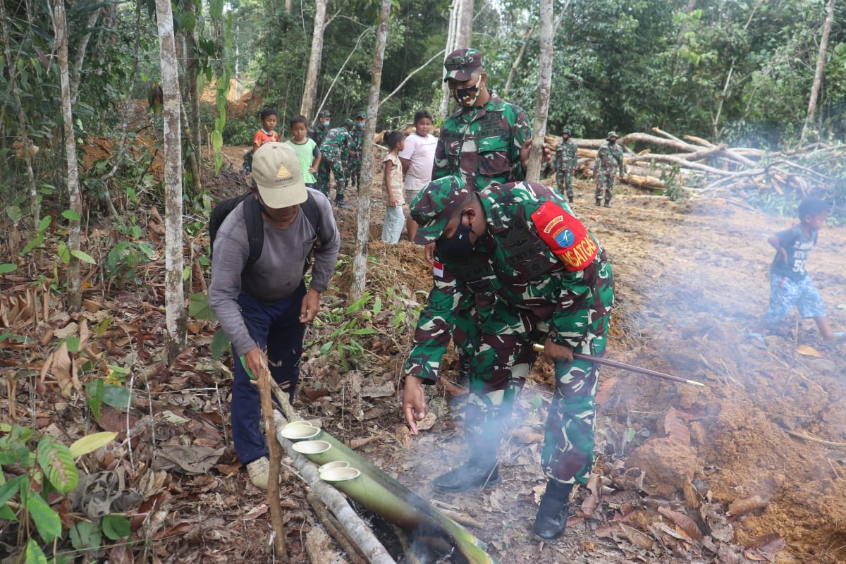 Pengkadan – Dandim 1206/PSB Letkol Inf Jemi Oktis Oil S.I.P, Kasdim 1206/PSB Agus Jaelani S.E, PJ Danramil 1206-09/Jongkong Pelda Didik Riyadi, para personil satgas Pra TMMD dan masyarakat memanfaatkan alam di sekitar lokasi TMMD. Selasa, (23/02/2021).