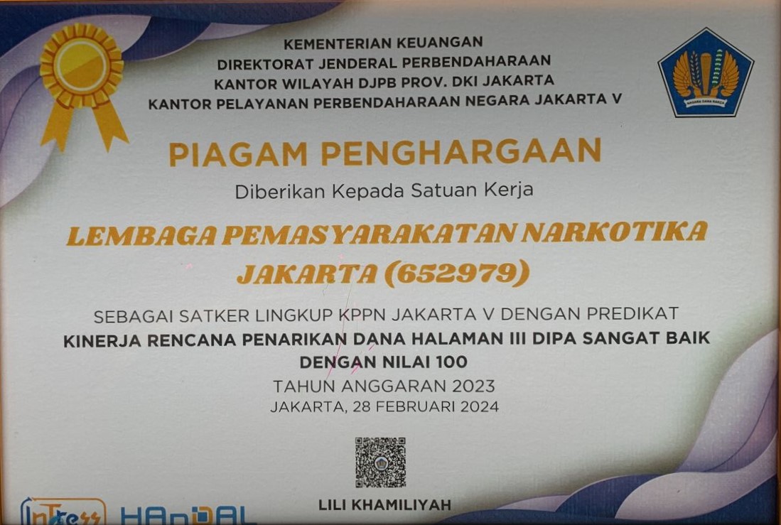 Piagam Penghargaan tersebut diterima langsung oleh Fonika Affandi selaku Kalapas Narkotika Jakarta.