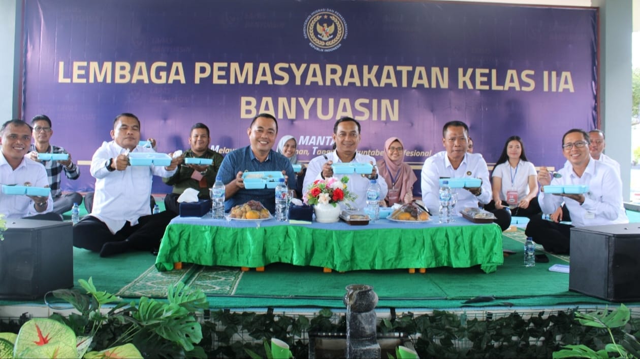 Kepala Kantor Wilayah Direktorat Jenderal Pemasyarakatan Sumatera Selatan Erwedi Supriyatno makan siang bersama dengan warga binaan Lapas Kelas IIA Banyuasin, Kamis (27/2/25).