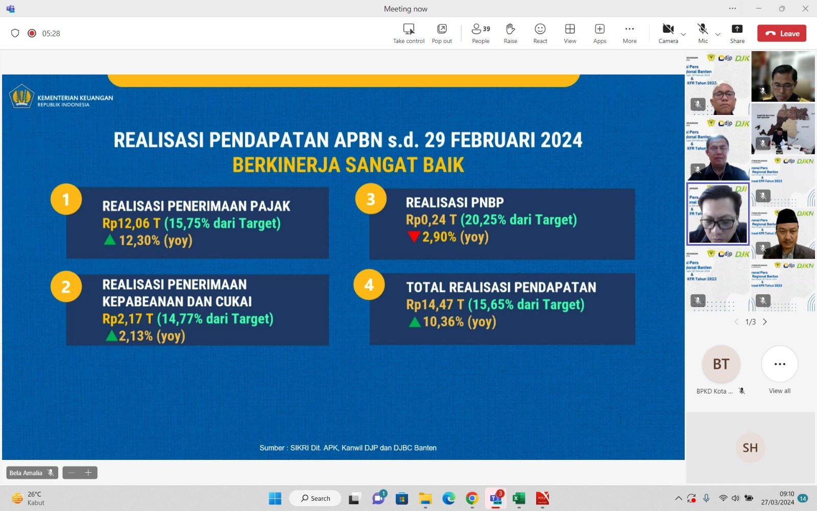 SERANG – Kinerja APBN Provinsi Banten pada awal tahun 2024 menunjukkan hasil yang sangat baik didukung oleh pendapatan negara yang tumbuh positif hampir di semua komponen dan belanja negara yang terakselerasi. Hal ini disampaikan oleh Plt. Kepala Kanwil Ditjen Perbendaharaan Provinsi Banten, M. Doddy Fachrudin, Kepala Bidang DP3 Kanwil Ditjen Pajak Provinsi Banten Sonny Agustinus, Kepala KPU Bea dan Cukai Provinsi Soekarno-Hatta Gatot Sugeng Wibowo dan Kepala Kanwil Ditjen Kekayaan Negara Provinsi Banten Djanurindro Wibowo dalam siaran pers yang diselenggarakan secara daring melalui Microsoft Teams Meeting, Rabu (27/3).