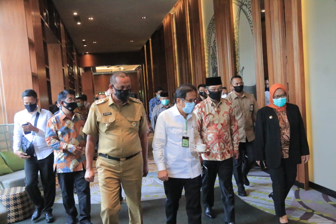 Bersama Mentri Agraria dan Tata Ruang Dr. Sofyan A Djalil, SH, MA, MALD, Gubernur Jawa Barat Ridwan Kamil menggelar rapat Koordinasi rencana tata ruang se-Jawa Barat yang dilaksanakan di Hotel Pulman Vimala Hills Megamendung Bogor, Senin (27/07/20).