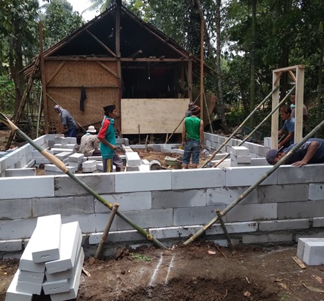 Rumah warga tak mampu ini yang awalnya rumah panggung bilik bambu, kini dibangun dengan bantuan material dari PT Aam Prima Arta.” Sedangkan tenaga kerjanya melibatkan swadaya masyarakat sekitar.” Jelasnya
