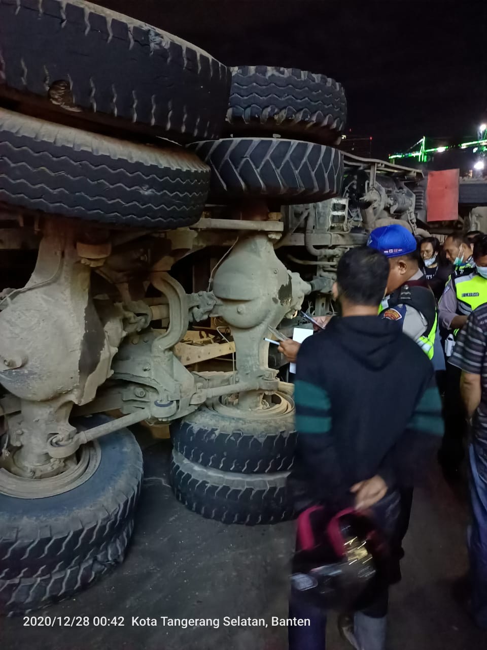 Menurut keterangan dari beberapa saksi mata,Truk bermuatan Batu split tersebu tiba tiba berjalan oleng dan terbalik di jalan Raya Serpong dan kemudian menimpa Dua kendaraann yang berada disebelah Mobil dump Truk.