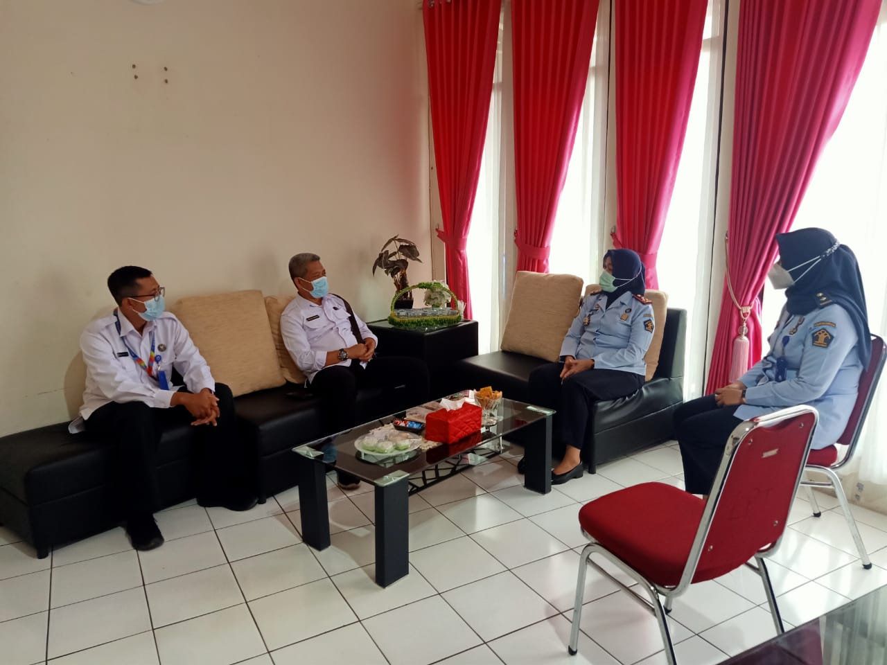 Kepala Lapas Perempuan Kelas IIA Tangerang Esti Wahyuningsih didampingi Kasi Binapi Nuraini Prasetiawati menerima kunjungan dari Kepala Badan Narkotika Nasional Kota Tangerang Ichlas Gunawan di ruang kerja Kalapas. Kunjungan Kepala BNNK kali ini bertujuan untuk pamit undur diri karena telah ditugaskan ke BNN pusat bagian Kabag Ortala Kepegawaian.