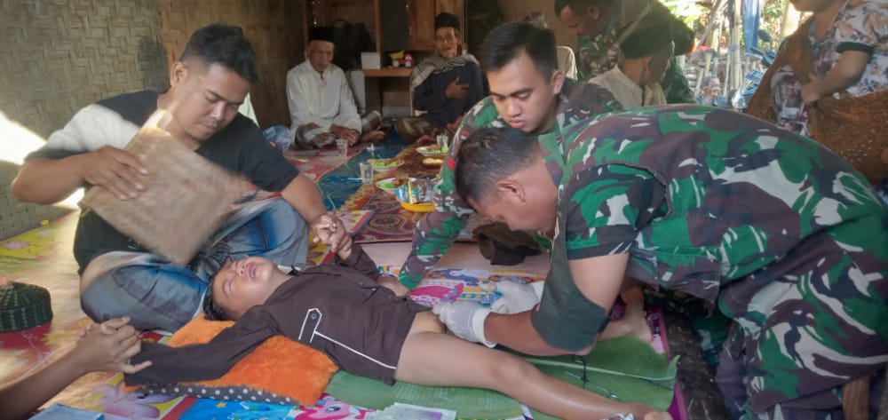 SIBERINDO.CO – Tim kesehatan tentara manunggal membangun desa (Timkes TMMD) ke 110 Kodim 0603 Lebak melakukan khitan atau sunat kepada Fiki(6) dan Rehan(8) dua bocah warga kampung Leuwibuled, Desa Jayasari, Kecamatan Cimarga, Kabupaten Lebak.
