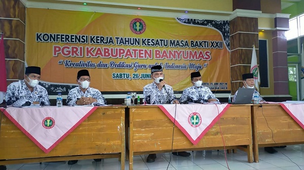 Hal itu diungkapkan oleh Bupati Banyumas, Achmad Husein, pada Konferensi Kerja Tahun Pertama 2021 yang digelar secara daring dan luring, di Gedung Guru Sokaraja, Sabtu (26/6/2021). Bupati berharap program kerja PGRI lebih efektif, implementatif, dan adaptif sesuai perubahan. Sehingga, institusi pendidikan dapat menghasilkan peserta didik yang beriman, bertakwa, berakhlak mulia, sehat, berilmu, cakap, kreatif, mandiri, serta menjadi warga negara yang demokratis, dan bertanggung jawab.