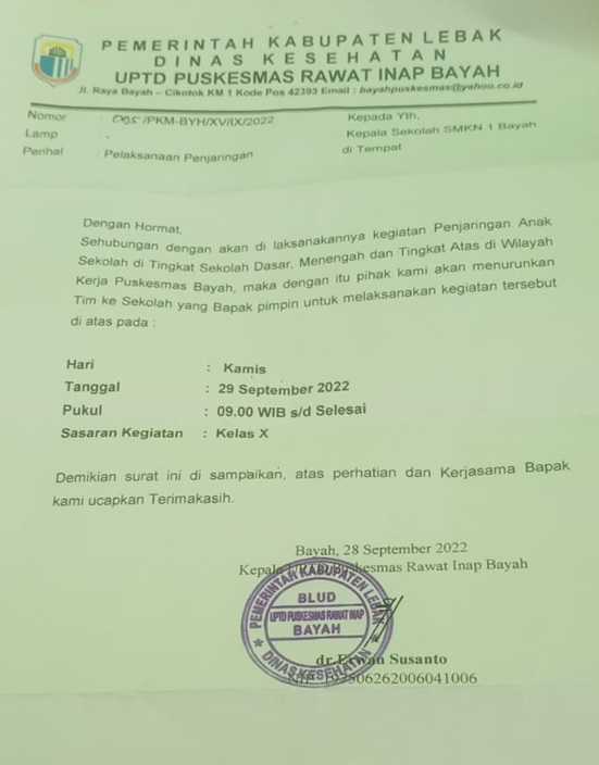 “Sementara Kepala Puskesmas Bayah dr. Erwan Susanto “ saat dihubungi via WhatsApp “ membenarkan bahwa hari ini team Nakes Puskesmas Bayah sedang menggelar kegiatan Penjaringan Anak Sekolah SMKN 1 Bayah, Pemeriksaan Mulut, Tensi, berat badan, tinggi badan dan juga lainnya, Imbuhnya.