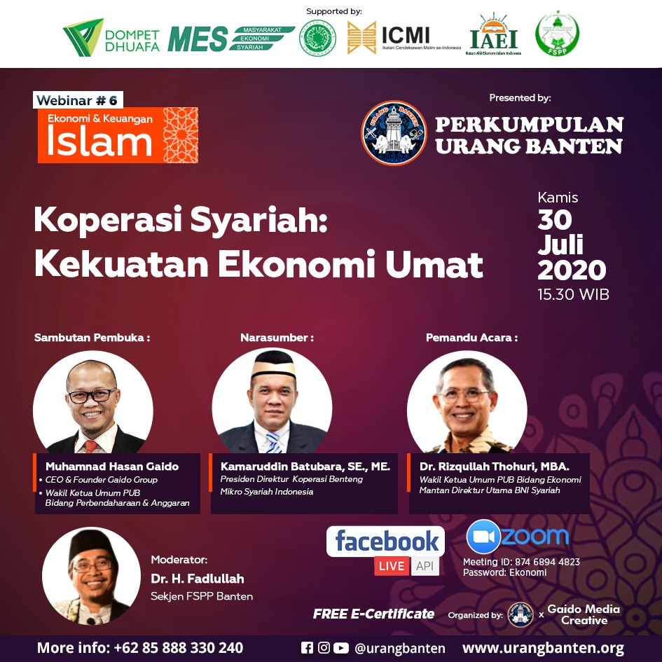 Perkumpulan Urang Banten (PUB) tempat bertemunya semua lapisan masyrakat atau umat dan PUB mengadakan Webinar Ekonomi dan Keuangan yang dibuka oleh M Hasan Gaido, CEO dan Founder Gaido Group sekaligus Wakil ketua umum PUB bidang Perbendaharaan dan angaran, komarudin Batubara, Presiden Direktur Koprasi Syariah Benteng Mikro Indonesia sebagai Narasumber, Dr Rizqullah Thohuri, Wakil ketua umum PUB bidang Ekonomi, dan moderator H. Fadlullah Sekjan FSPP Provinsi Banten. Perkumpulan Urang Banten PUB terdiri, Urang banten lahir di banten dan tinggal mengabdi di banten, Urang banten lahir di banten atau keturunan tinggal di luar banten, Urang banten yang tinggal atau mengabdi di banten lahir bukan dari banten kata M Hasan Gaido saat Sambutan pembukaan Webiner PUB 30/7/20. M Hasan Gaido menjelaskan ” visi PUB adalah Banten baru, Banten bangkit, Banten juara, Masyrakatnya sejahtera dengan bingkai iman dan taqwa. Kita mengetahui Provinsi Banten Populasi dengan 12 juta orang dan hampir 90 persen beragama isalm dan menjadi penopang ibukaota Negara DKI Jakarta. M Hasan Gaido memaparkan,” Pendapatan daerah ke enam Nasional dari 34 Provinsi menjadi ke tiga, tujuan investasi di Indoneisa, selain itu kita memiliki sejarah kesultanan banten yang terkenal di dunia baik secara perdagangan maupun hasil buminya. Melalui webinar series ekonomi dan keuangan Islam yang ke enam ini kita mengangkat tema” Koprasi Syariah Sebagai Kekuatan Ekonomi Umat” jelasnya. Masih kata M Hasan Gaido, Semoga program ini mampu mengeduakais semua masyrakat di banten dan di indoneisa pada umumnya, sehingha pada waktunya Indonesia sebagai sentral ekonomi dan keuangan syadiah dunia di mulai dari banten, Pemerintah sangat konsen dengan dibentuknya KNEKS yang dipimpin langsung oleh Presiden Joko Widodo dan wakil Presiden KH Maruf Amin sebagai ketua hariannya. M Hasan Gaido berharap, Mari kita bersatu padu terlibat dan melibatkan diri dari peradaban ekonomi dan keuangan syariah dunia saat ini, banten akan segera lahir bank banten syariah yang sudah lama di cita citakan oleh semua masyrakat banten yang terkenal dengan tanah jawara dan tanah ulama dengan moto iman dan taqwa. M Hasan Gaido mengajak , kita semua agar mau hijrah ke ekonomi dan keuangan syariah mulai dari terkecil yang bisa kita lakukan dan kita sambut hari keemasan untuk kaum muslimain di dunia selain itu hari ini adalah hari wukuf arafah haji 9 dzulhijah 1441. Kita doakan semoga semua jamaah mendapatkan haji yang mabruru dan kita semua mendapatkan pahala haji dengan melaksanakan puasa arafah. Sebelum menutup Sambutannya M Hasan Gaido atas nama PUB mengucapkan selamat Idul Adha bagi kaum muslimin yang meryakannya dan mohon maaf lahrir dan bathin,” ujarnya.***