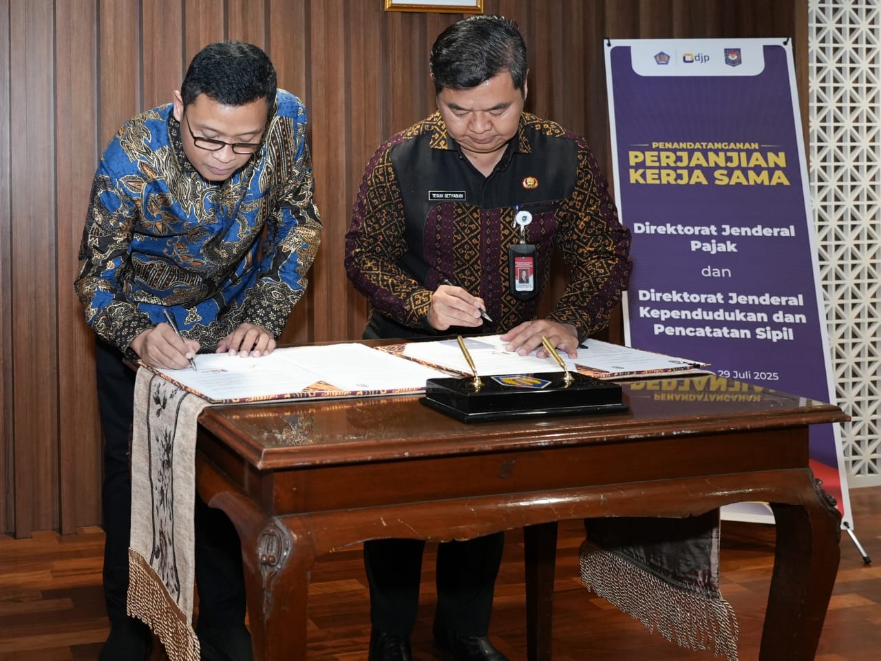 JAKARTA – Direktur Jenderal Pajak (Dirjen Pajak) Kementerian Keuangan Bimo Wijayanto bersama dengan Direktur Jenderal Kependudukan dan Pencatatan Sipil (Dirjen Dukcapil) Kementerian Dalam Negeri Teguh Setyabudi menandatangani perjanjian kerja sama (PKS) antara Direktorat Jenderal Pajak (DJP) dan Direktorat Jenderal Kependudukan dan Pencatatan Sipil (Ditjen Dukcapil). Kegiatan penandatanganan tersebut dilaksanakan di Gedung Cakti KPDJP, pada Selasa, 29 Juli 2025.