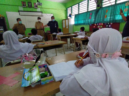 Jakarta – Camat Ciracas, Mamad, meninjau pelaksanaan pembelajaran tatap muka (PTM) Terbatas di SDN Kelapa Dua Wetan 02, Senin (30/8). Pada pelaksanaan hari pertama ini, tercatat ada 192 pelajar kelas I dan IV yang mengikuti PTM di sekolah tersebut. Mereka terbagi dalam dua gelombang.