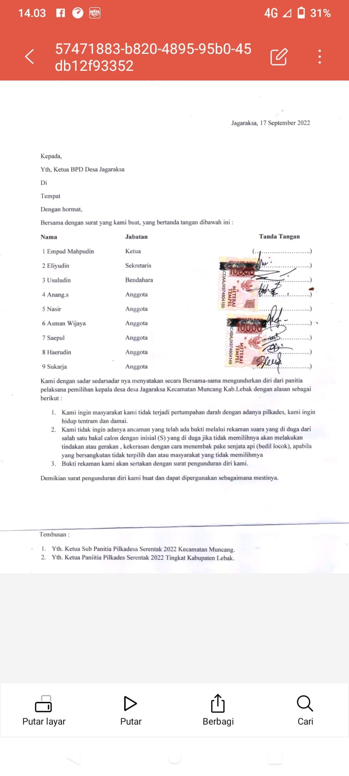 Empud ketua panitia desa jagaraksa sekaligus tim 9 mengatakan membenarkan 6 anggota panitia yang terdiri dari parades semua mengundurkan diri, saya juga sempat pada tgl 17 /9/2022. Mengundurkan diri tapi saya bisa kerja lagi dan terkait SK panitia yang lama masih ada dengan nama nama yang lama karena di aturan gak bisa di bikin lagi kami pun membentuk penitia baru pungkasnya.