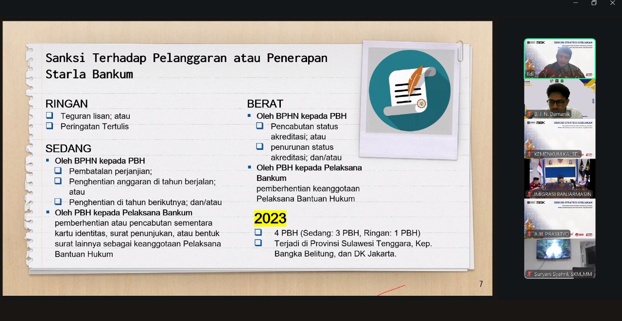 Dari hasil diskusi, para peserta sepakat bahwa peningkatan kualitas layanan bantuan hukum harus dimulai dari penerapan Starla Bankum sesuai dengan amanat Permenkumham Nomor 4 Tahun 2021. Dengan penerapan standar tersebut, diharapkan PBH mampu memberikan layanan hukum yang profesional dan berorientasi pada kepuasan penerima bantuan hukum. Selain itu, perlu adanya sinergi antara pemerintah daerah, perguruan tinggi, dan lembaga penegak hukum untuk memperkuat jaringan bantuan hukum yang inklusif, merata, dan berkelanjutan.