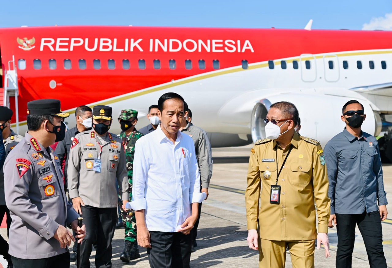 Presiden RI Joko Widodo (Jokowi) tiba di Provinsi Kalimantan Barat untuk melakukan kunjungan kerja, Selasa (29/11/2022). Setibanya di Bandar Udara (Bandara) Internasional Supadio, Kabupaten Kubu Raya, Presiden langsung menuju Kota Pontianak. Presiden diagendakan untuk meresmikan Pembukaan Bahaupm Bide Bahana Tariu Borneo Bangkule Rajaking (TBBR).