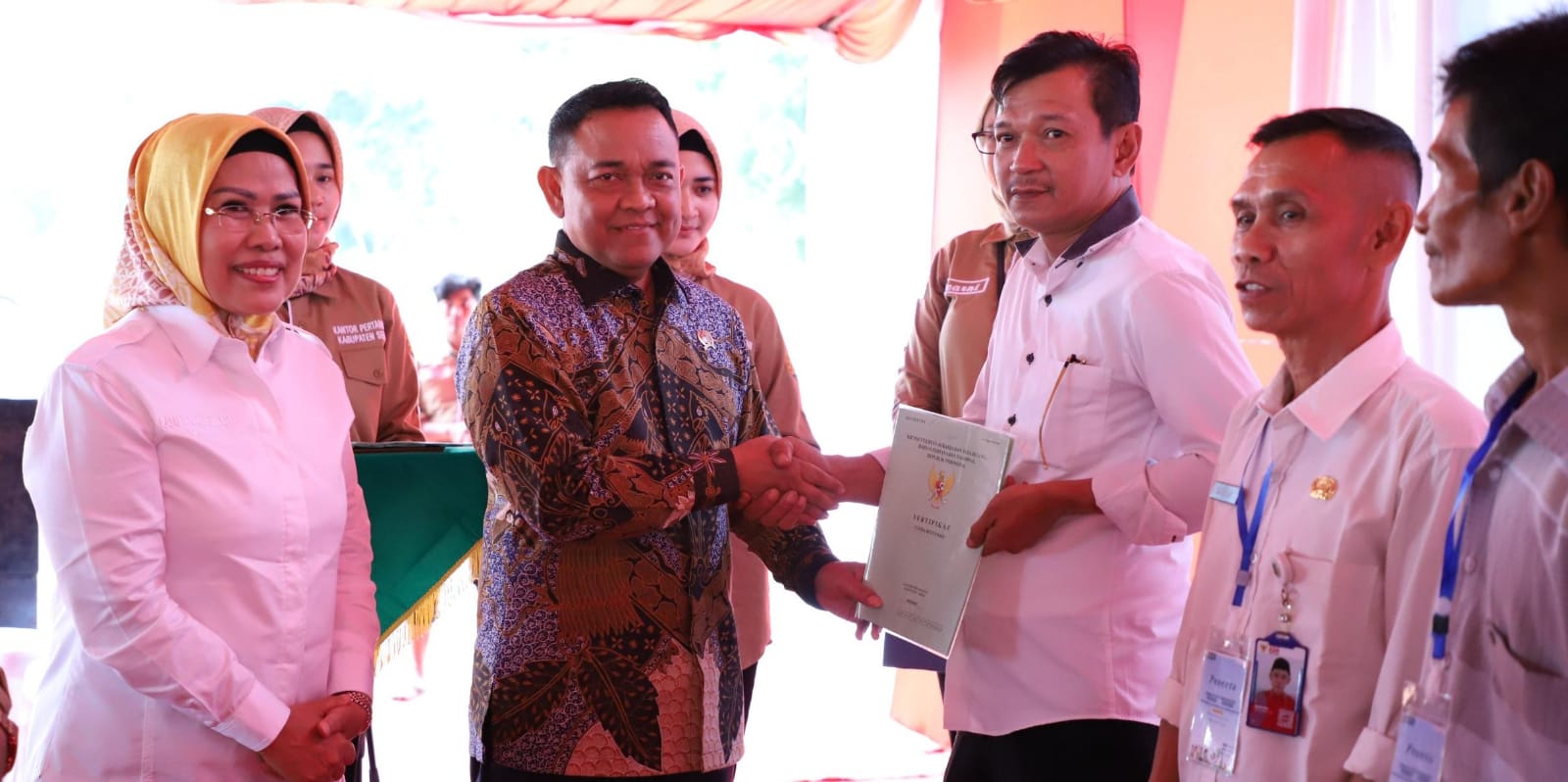 SERANG – Kepala Kantor Wilayah Badan Pertanahan Nasional (BPN) Provinsi Banten, Sudaryanto dan Bupati Serang Ratu Tatu Chasanah menyerahkan 70 sertipikat kegiatan Pendaftaran Tanah Sistematis Lengkap (PTSL) dan Lintas Sektor Tahun Anggaran 2023 di Desa Gunung Sari, Kecamatan Gunung Sari, Kabupaten Serang, Banten, pada Rabu (31/01/2024).