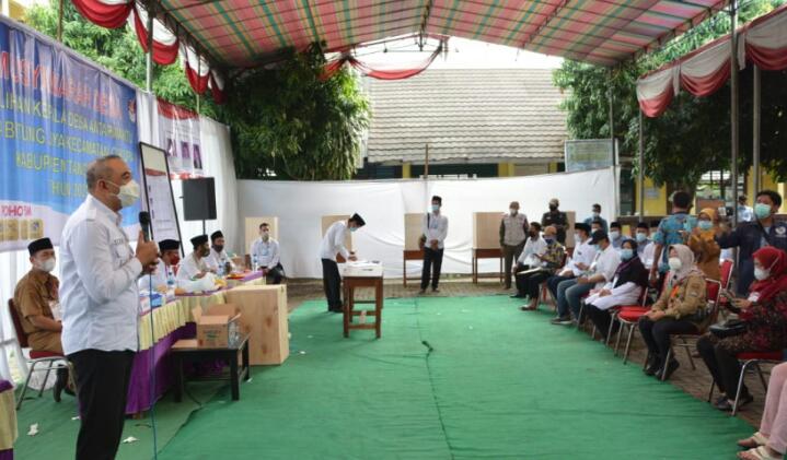 Tangerang – Bupati Tangerang Ahmed Zaki Iskandar memantau langsung Pemilihan Kepala Desa Pergantian Antar Waktu (PAW) di Desa Bitung Jaya Kecamatan Cikupa Kabupaten Tangerang, proses pemilihan tersebut berlangsung di halaman Kantor Desa Bitung Jaya, Minggu (30/5/2021).