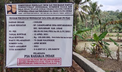 Melalui Program Percepatan Tata Guna Air Irigasi ( P3 – TGAI) Daerah Irigasi Cidilem, Lokasi Kegiatan Kp. Cadas Ngampar desa Kertaraharja Kecamatan Banjarsari Kabupaten Lebak, No.PKS : HK.02.03/246/PKS/Az.05.3/IV/2021, Tanggal kontrak 12 April 2021, Nilai Kontrak : Rp 195.000.000,- Waktu pelaksanaan 75 hari kalender, Sumber Dana : APBN Murni Tahun 2021, Titik Koordinat : S.6.659719”L 105.948078 “ Pelaksana : P3A Raharja Indah *(RED)